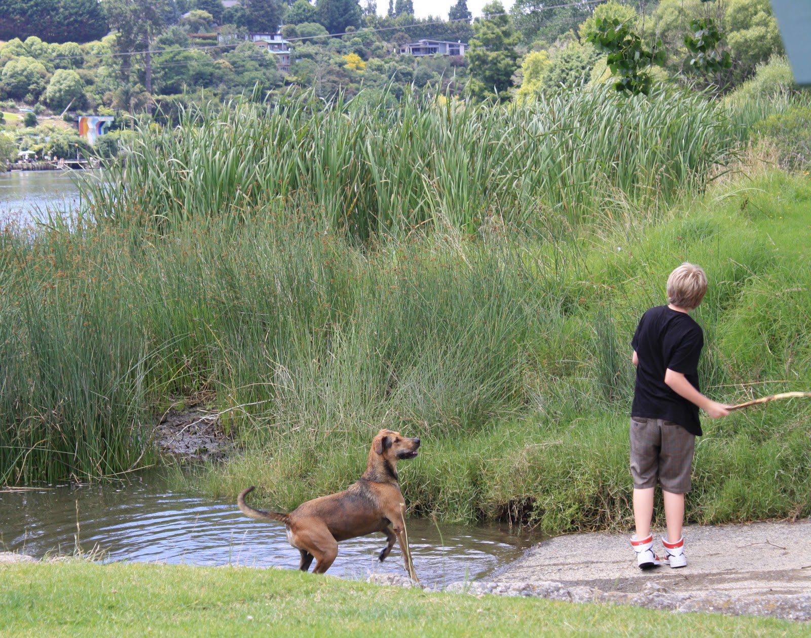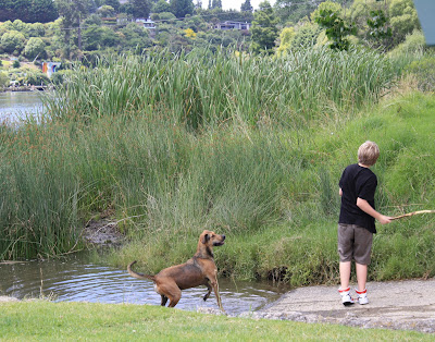 Today on the way back from a retail therapy trip to our nearest city, I stopped at a river-side area to eat my lunch. This fellow was having enormous fun fetching the stick which his young owner was throwing waaaay out into the river.